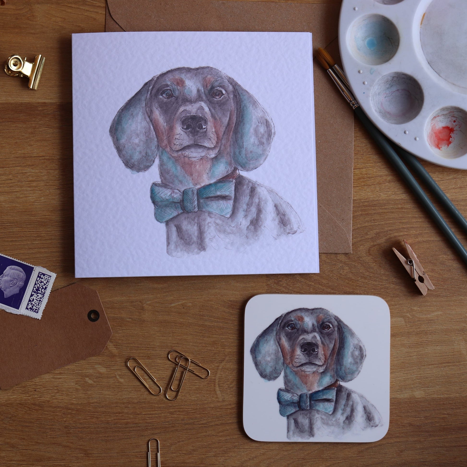 Featuring one of our best selling illustrations, a colourful blue Dachshund with a bow tie. Why not buy the matching card for the perfect gift set, we also have matching keyrings. All our cards are blank so make the perfect keepsake.