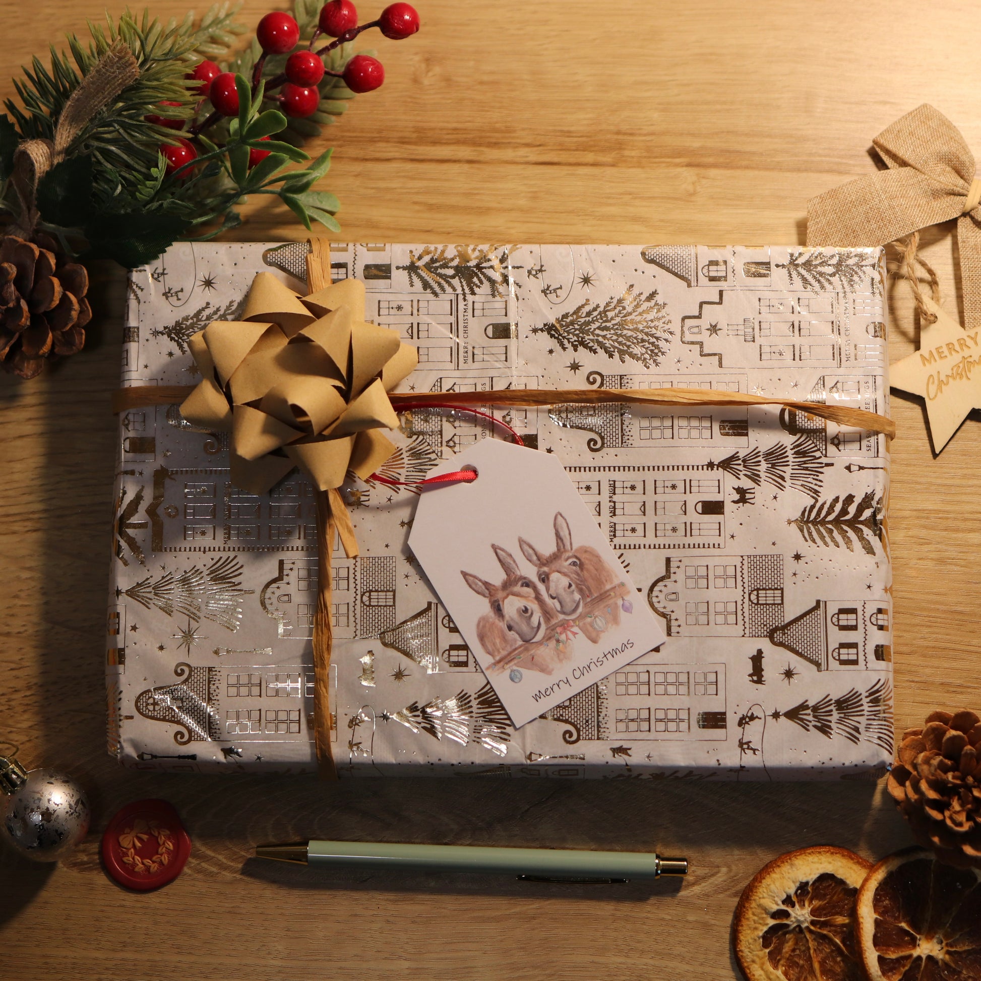 Festive Donkeys gift tags, featuring a handprinted watercolour illustration. Why not buy the matching card for the perfect gift set this Christmas.