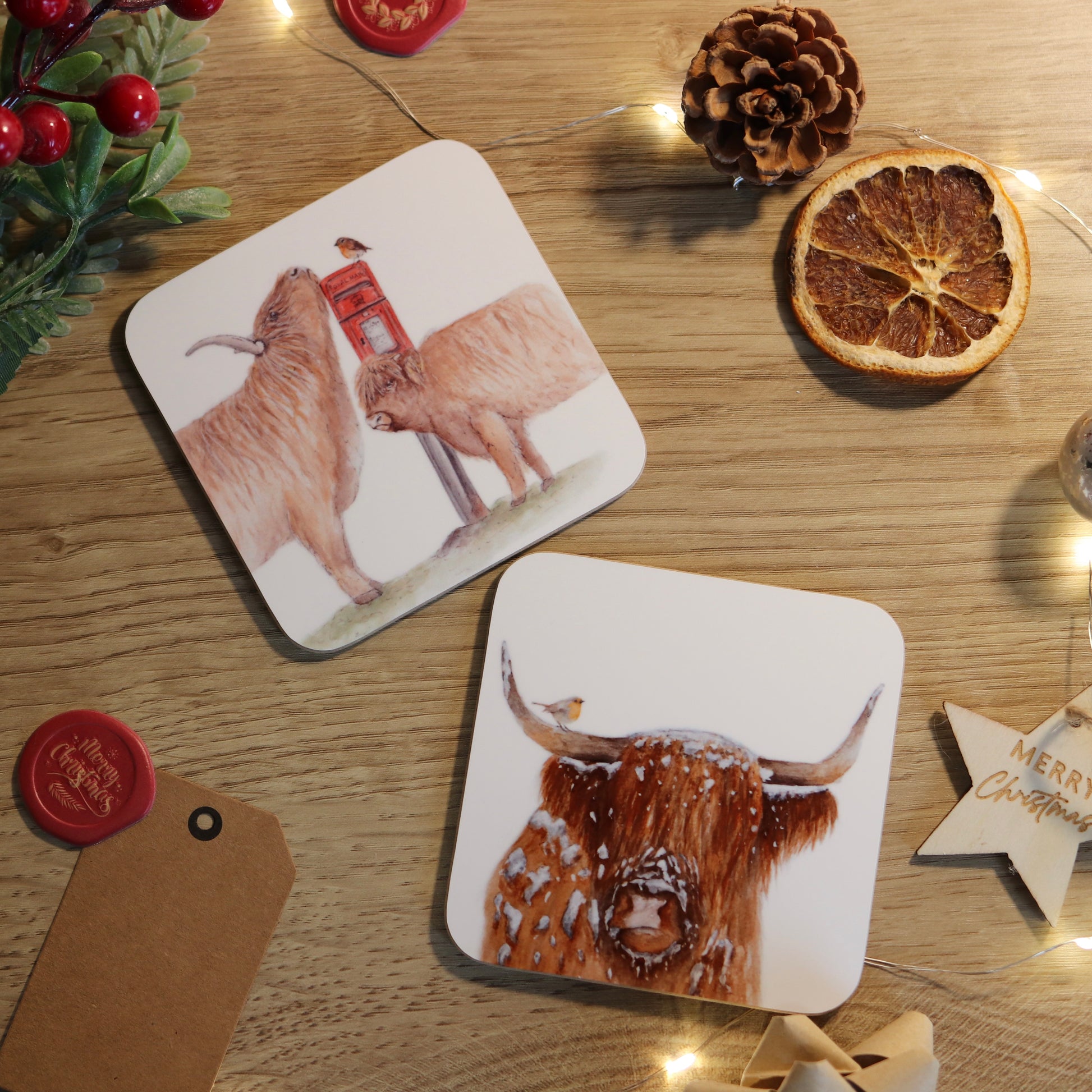 Festive Highlands coaster, featuring a handprinted watercolour illustration. Why not buy the matching card for the perfect gift set this Christmas. All our cards are blank so make the perfect keepsake.