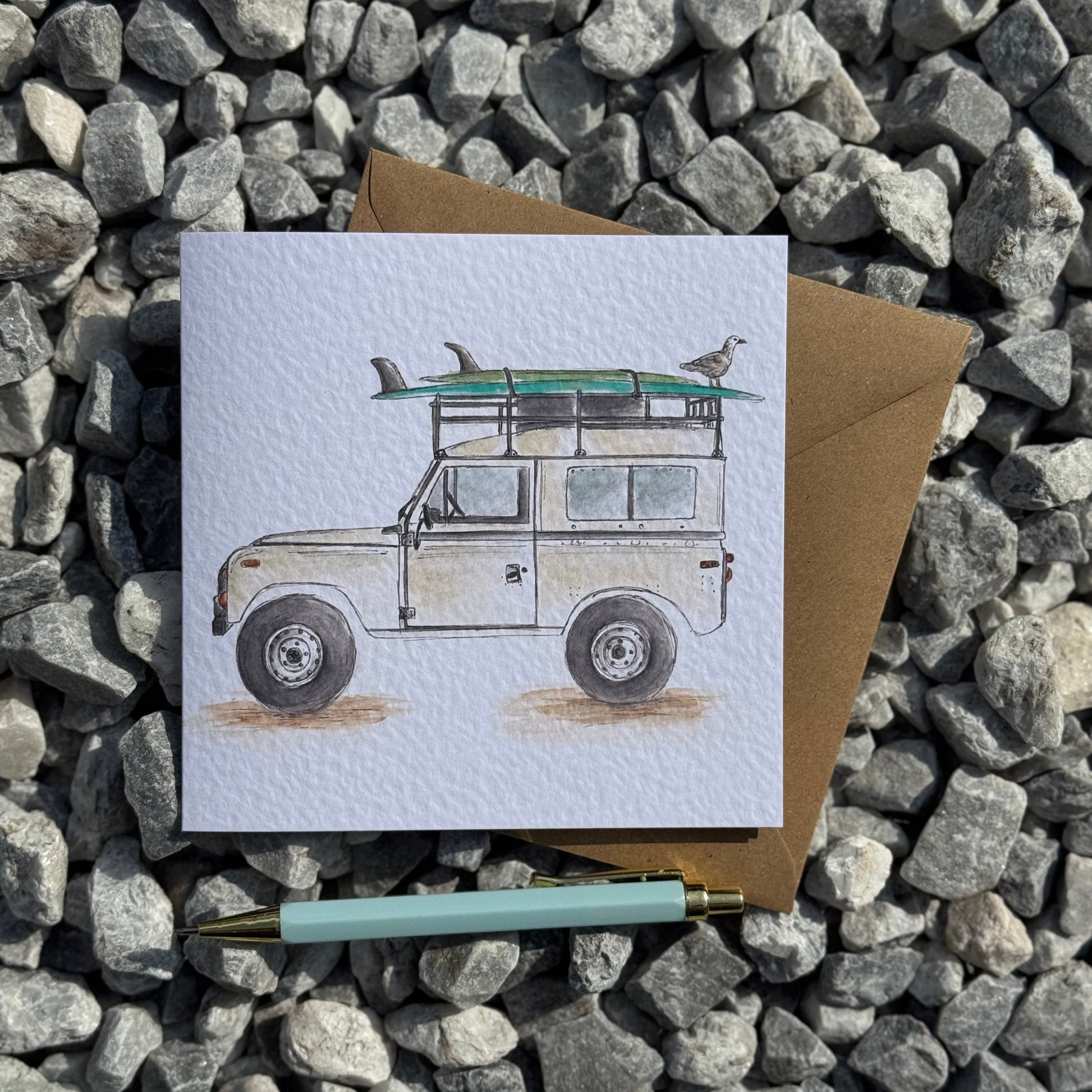 Surf Defender seaside greeting card, created from handprinted watercolour illustration.